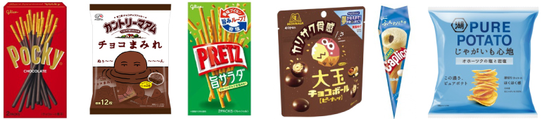 グリコ・明治・カルビー・不二家・ブルボン・森永・ロッテ・東ハト・湖池屋・ネスレ・フルタ製菓・丸大食品・ケロッグ・やおきん・ハマダコンフェクト・みの食・丸彦・前田製菓・三河屋・ぼんち・ヤガイ・マルカ・夏目製菓・扇雀飴・豆鶴・輸入菓子など